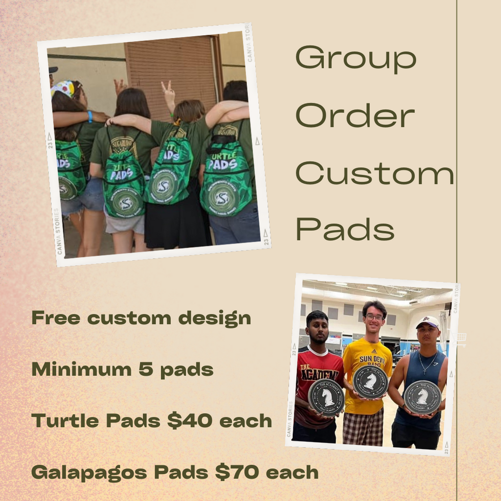 Get your logo or design on our pads for free when you order a minimum of 5 pads. Including a discounted rate per pad. Turtle Pads start at $40 per pad, and Galapagos Pads start at $70 per pad. There are bigger discounts for larger quantities of pads, just let us know how many you need!